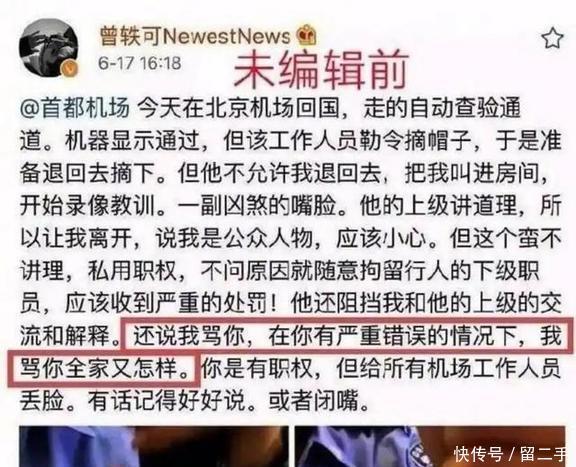 后来她还反过来抨击,在自己的社交平台上发文抱怨边检的警察随便抓人,还气呼呼地说“骂你全家又怎么了”。甚至还发了9张照片,曝光了边检民警的证件照,把人家的姓名、职位等私密信息都泄露出来了。还想挑动大家在网上攻击那位民警,一开始观众确实是支持她的。她把自己打造成了个受害者的样子,不过等相关部门调查清楚事情的真相,实在是曾轶可自己先犯规,观众这才明白,原来明星的话也不都是可信的。